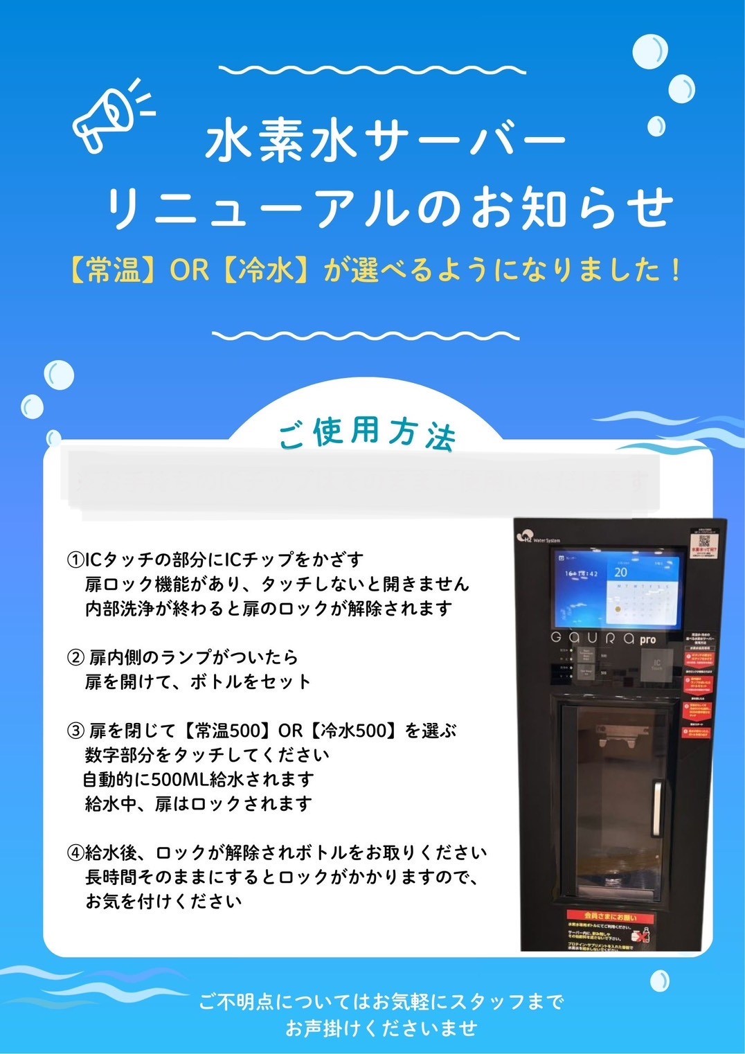 水素水サーバー、入れ替えのお知らせ